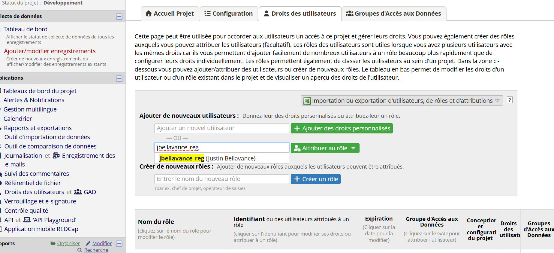 Les accès pour un projet spécifique sont octroyés par le chercheur ou l’administrateur responsable du projet. Toutefois, seules les personnes possédant un compte REDCap pourront être ajoutées au projet.