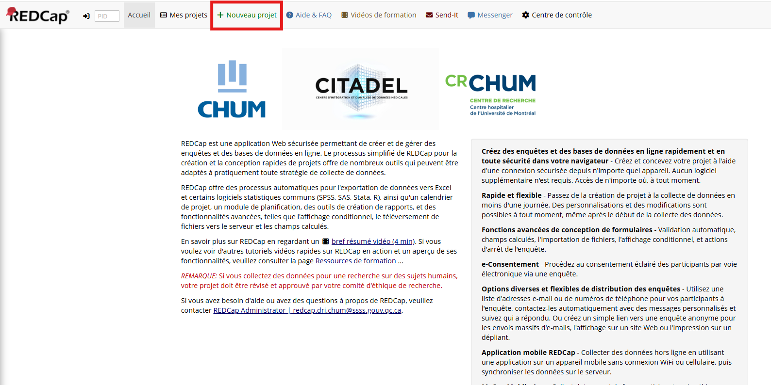 Au CRCHUM, il a été établi que seuls les chercheurs ayant un statut en règle possèdent un compte permettant la création de projets.